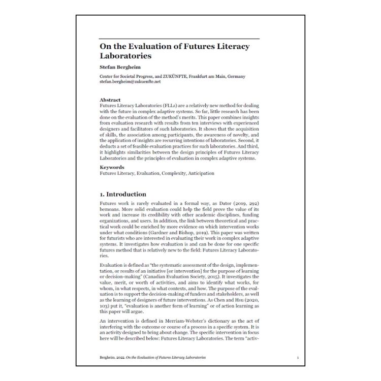 Intensiv befasse ich mich seit 2021 damit, was man alles mit Zukünftelaboren erreichen kann und wie man die Erreichung dieser Ziele überprüfen kann. Die Studie "On the Evaluation of Futures Literacy Laboratories" von 2022 bietet eine erste Übersicht. Es gibt auch einen 17-minütigen KI-Podcast dazu in englischer Sprache.