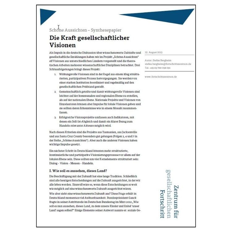 In der 2008 gegründeten Denkfabrik “Zentrum für gesellschaftlichen Fortschritt” drehte sich zu Beginn alles um partizipative Visionsprozesse zum Thema Lebensqualität. Wir analysierten Prozesse in anderen Ländern und führten eigene Prozesse durch. In Studien wie "Die Kraft gesellschaftlicher Visionen" teilten wir unsere Erkenntnisse.