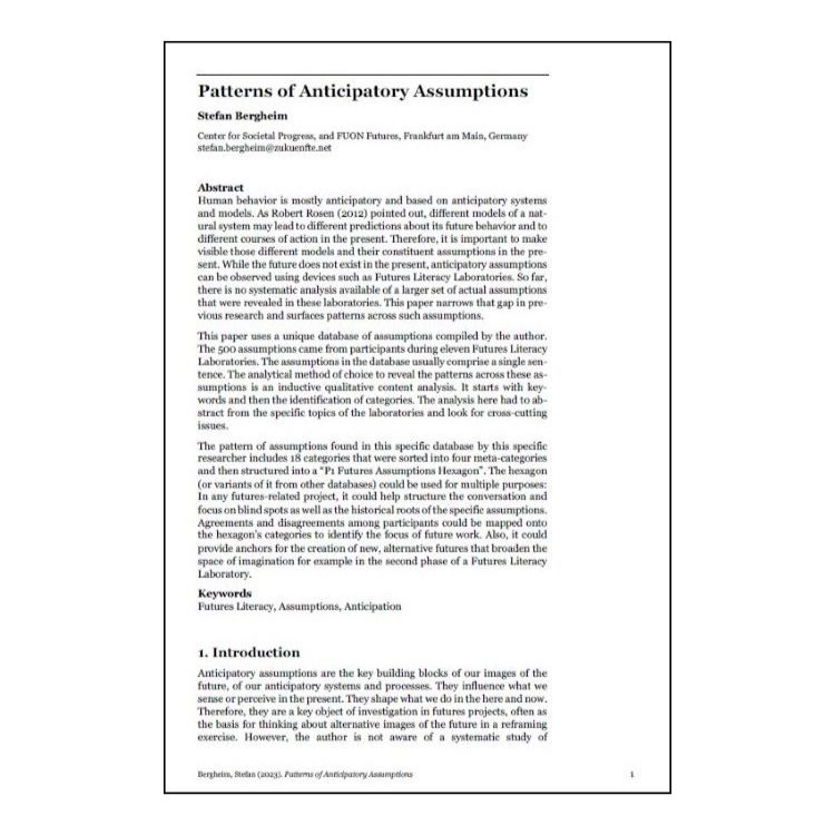 Der wichtigste Untersuchungsgegenstand in Zukünftelaboren sind die Annahmen, die hinter den Vorstellungen von Zukunft liegen. Sie bestimmen, was wir in der Gegenwart wahrnehmen und wie wir handeln. Für "Patterns of Anticipatory Assumptions" bin ich Ende 2023 den Mustern in 500 Annahmen aus unseren Zukünftelaboren nachgegangen. Dazu gibt es einen 13-minütigen KI-Podcast in englischer Sprache.